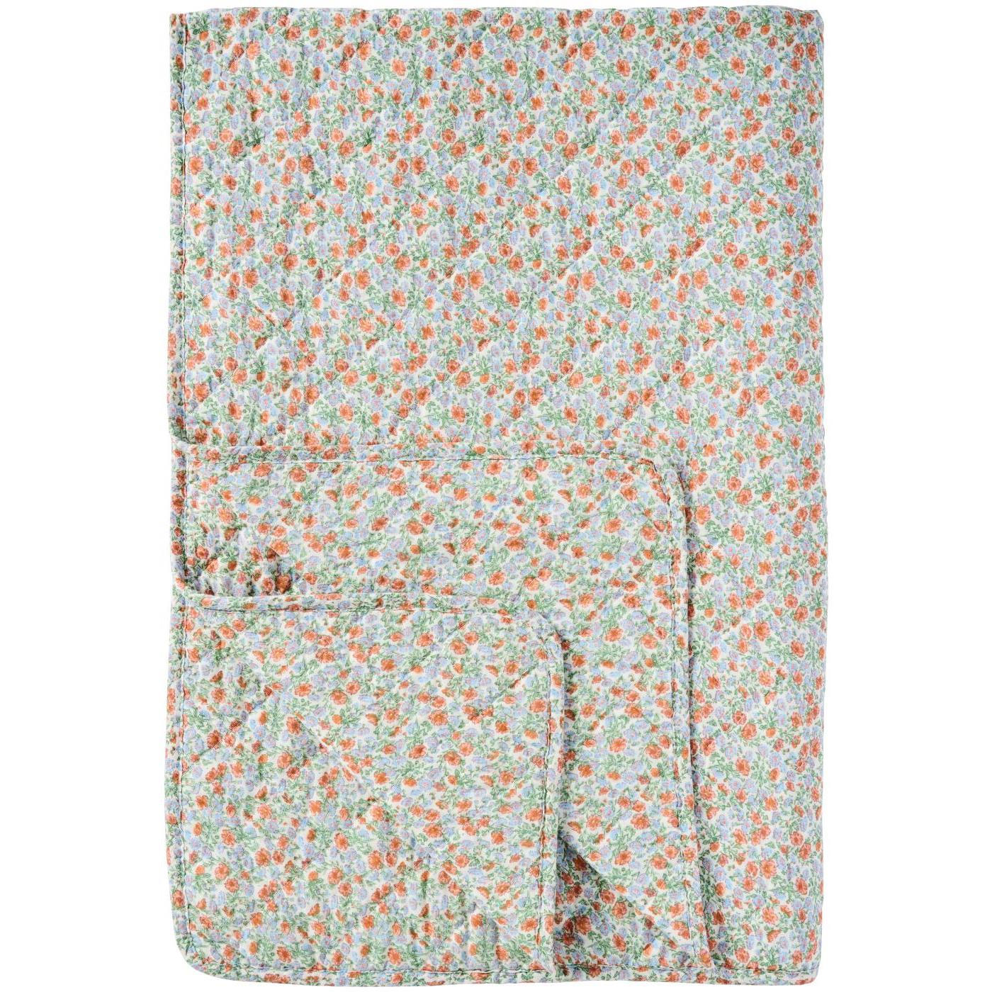 Ett lätt täcke i mjuk bomullskvalitet med ett gulligt blommönster i starka sommarfärger, perfekt för mysiga stunder inomhus eller kyliga kvällar ute.